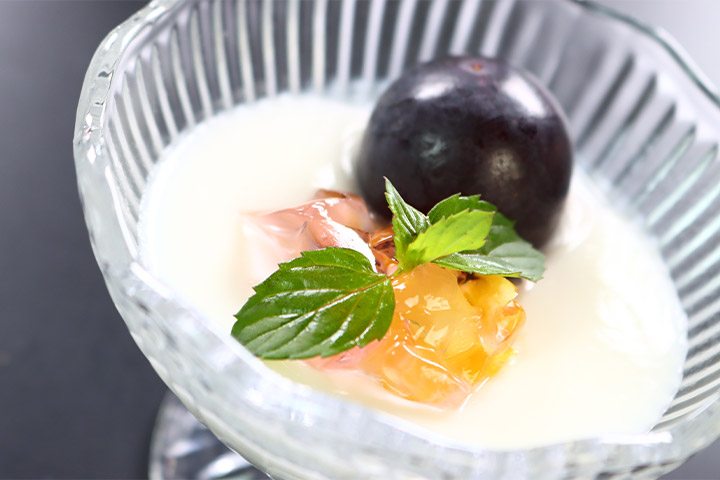 飛騨牛陶板焼 / 前菜3種盛り / お造り / 銀鮭味噌煮と2種のあしらい / パイ包みのスープ / 季節の天ぷら / 塩烏賊と茗荷の三杯酢 / 海老フリッター / ご飯(新潟県産こしひかり) / 香の物 / アーモンドブラマンジェ カットフルーツ乗せ