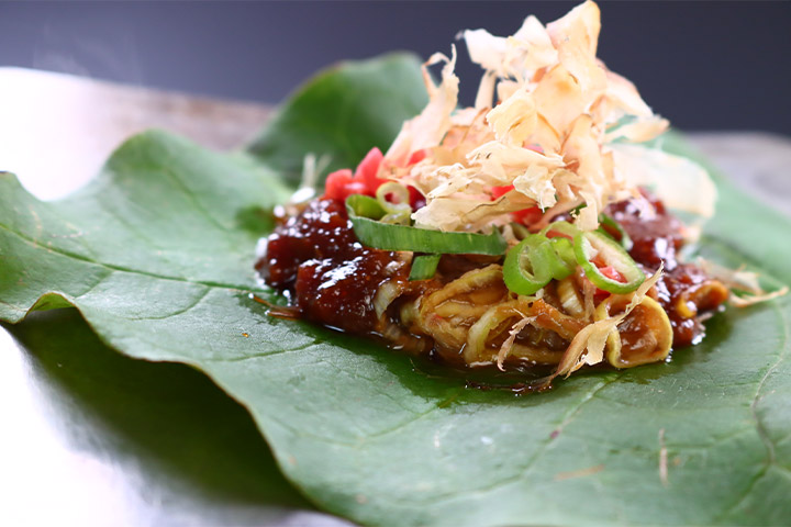 朝食は、飛騨名物「朴葉味噌」が付いた和食です。 味噌が乗った朴の木の葉は殺菌作用もあり、今でも重宝されております。